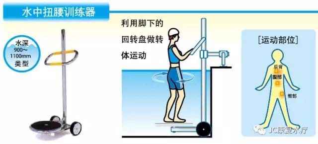水中康复训练是综合利用水的浮力、黏性阻力、静水压力和温度等特性在水中设计的康复训练。水的浮力可辅助运动,也可大大减小关节负荷,使运动更加简单安全;水的粘性阻力可提升运动强度,也可控制运动幅度和跌倒风险;水的压力可提高心肺功能,也利于消肿;水的温度可减轻疼痛,使身体更加放松。因此,水中训练将是女性、老年人及康复患者的最佳选择。通过最大化的利用水下运动的优势设计出的运动器械就是AQUA GYM水中康复训练器。水中康复训练器可以支持愉快、健康的水下运动,共含有7种类型: